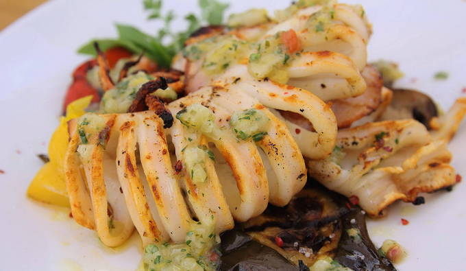 Een eenvoudig en heerlijk recept voor het koken van inktvis met groenten op de grill