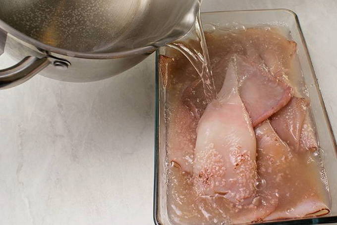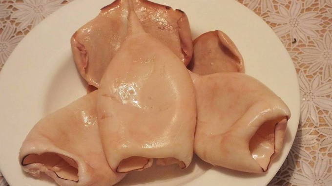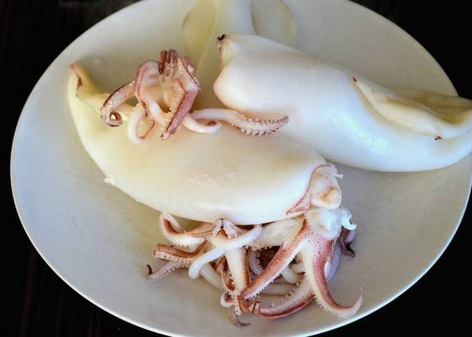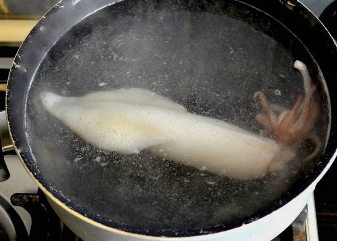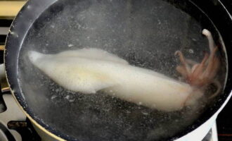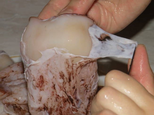 - Giet kokend water over de inktviskarkassen, verwijder de ingewanden en pel ze.