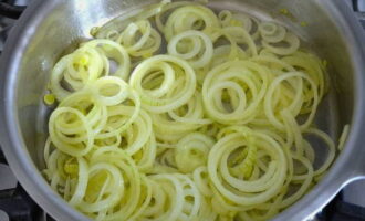 Snijd de ui in ringen en fruit deze in olie.