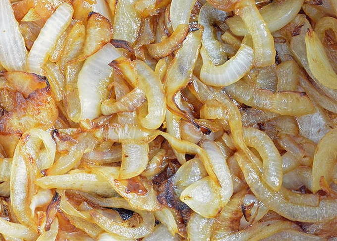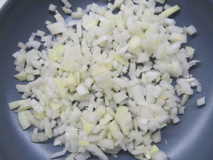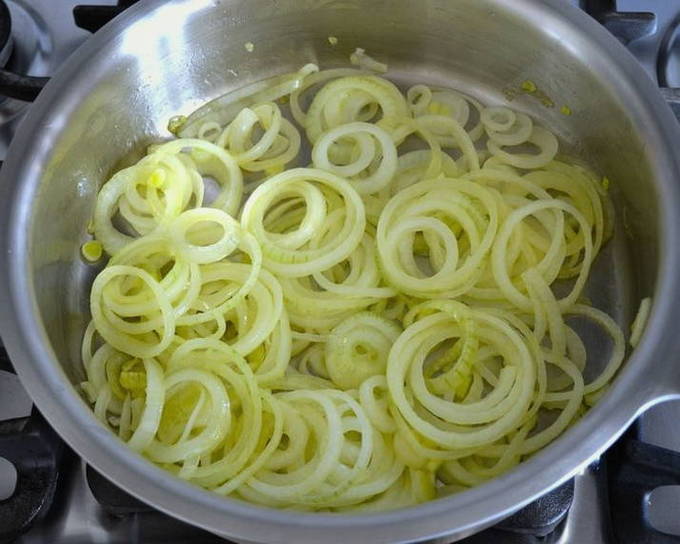 - Snipper de ui en bak in een pan in olie ongeveer 3 minuten.