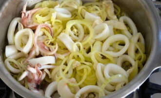 Als de groenten lichtbruin zijn, voeg je het inktvisvlees toe en kook je een paar minuten.