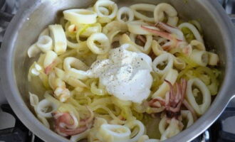 - Leg de gehakte inktvis op de ui en bak al roerend niet langer dan een minuut, voeg dan specerijen en kruiden toe, evenals zure room met bloem, en meng alles goed.