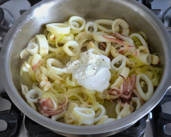 - Fruit in een geschikte koekenpan de ui en de gesneden inktvis met boter, voeg zure room toe, breng op smaak met zout en peper en laat 10 minuten sudderen.