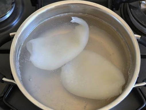 - Giet kokend water over het inktvisvlees en kook ongeveer 3 minuten, snij dan in reepjes.