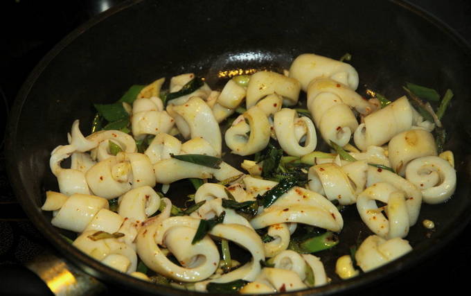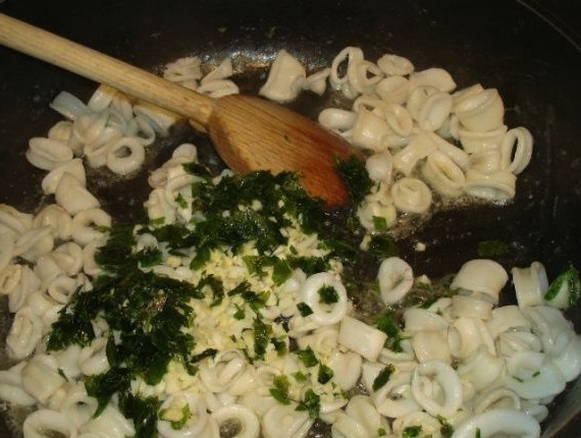 - Doe knoflook en peterselie in een koekenpan met olie, bak licht en leg de inktvis.