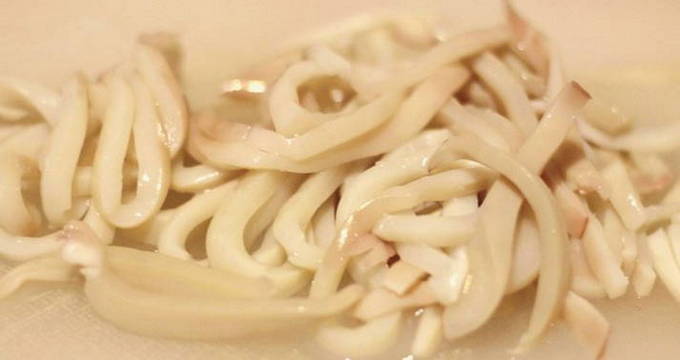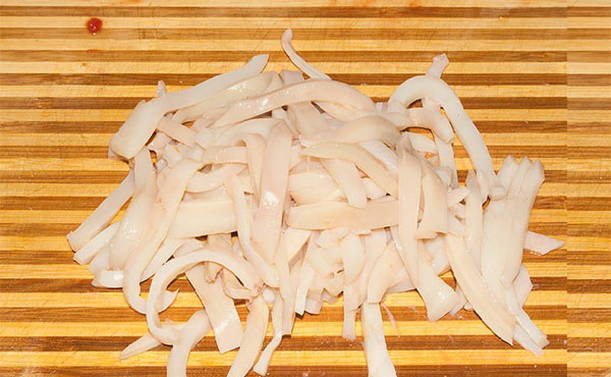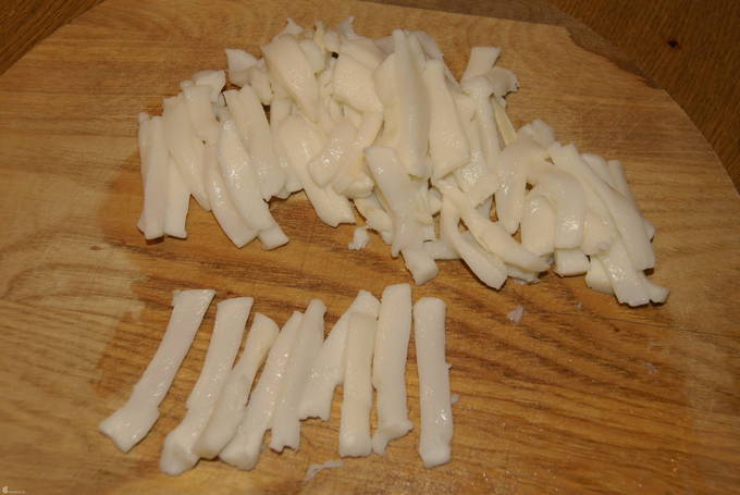 - Giet de inktvis met heet water en schil en schil.Snijd het vlees in reepjes.