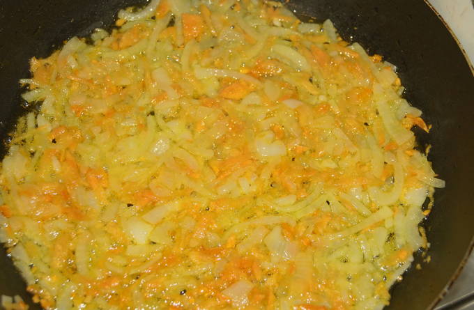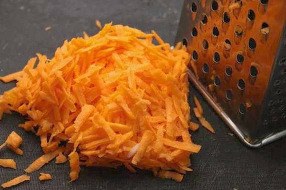 - Snijd de wortelen en uien: rasp de knolgewas, de ui had in halve ringen moeten worden gesneden.