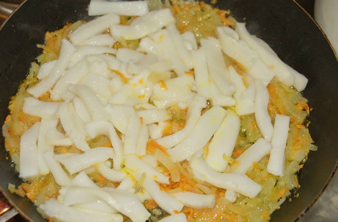 - Voeg inktvisreepjes toe aan wortelen en uien en laat niet langer dan 5 minuten in brand staan, breng op smaak met zout en peper.
