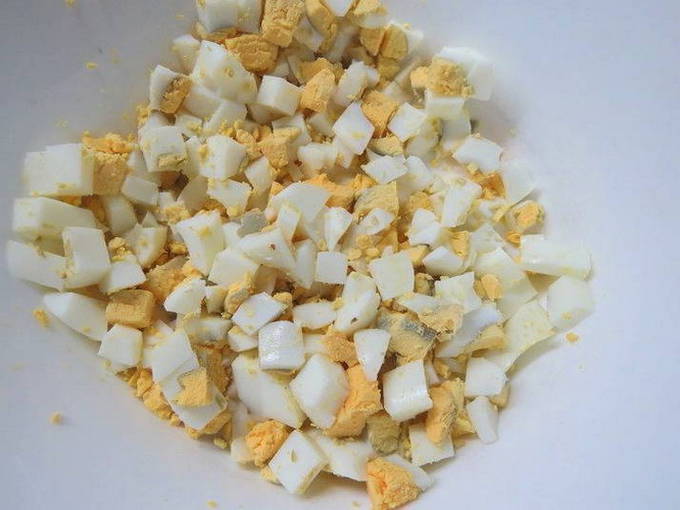 - Kook de eieren en snij ze in dezelfde blokjes als de uien en champignons zodat de inktvisvulling er glad uitziet.
