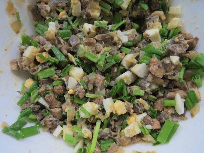 - Hak groene uienveren fijn en meng met gebakken champignons en eieren, voeg daar geraspte kaas toe.