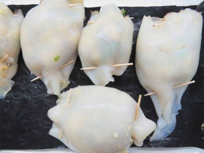 - Giet de inktvis korte tijd met heet water, verwijder de films, verwijder de binnenkant en droog. Leg het voorbereide gehakt stevig in elk karkas en maak het gat vast met tandenstokers zodat het er tijdens het koken niet uit valt.
