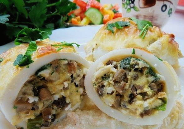 Op deze manier bereide inktvissen zijn geschikt als originele warme snack voor elke gelegenheid. Inktvisvlees past goed bij gesmolten kaas, gebakken uien en zure room.