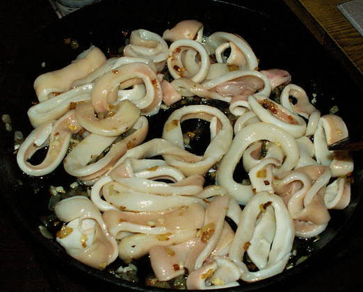 - Inktvis in zure roomsaus met knoflook in een pan