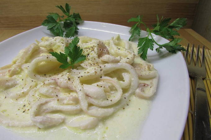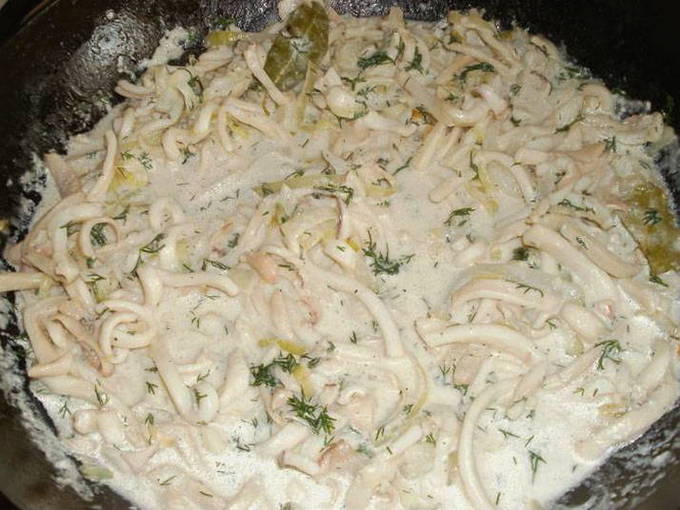 Stap-voor-stap recept voor het maken van inktvis in zure roomsaus met kaas