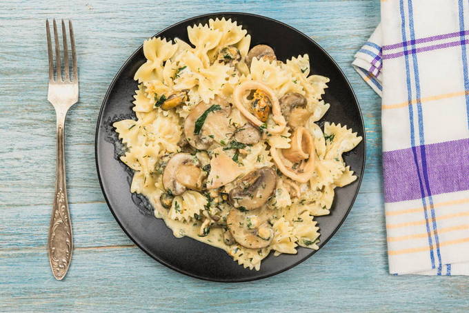 Pasta met inktvis is een goede optie voor een diner in mediterrane stijl. De zure roomsaus met zeevruchtensmaak doordringt de pasta en vormt een aanvulling op de smaak van de inktvis. Het is belangrijk om de pasta niet te gaar te laten worden, zodat deze niet uit elkaar valt na het koken in de saus.