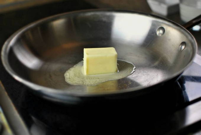 - Doe gehakte zeevruchten in boter verwarmd in een koekenpan en kook op hoog vuur gedurende ongeveer 2 minuten.