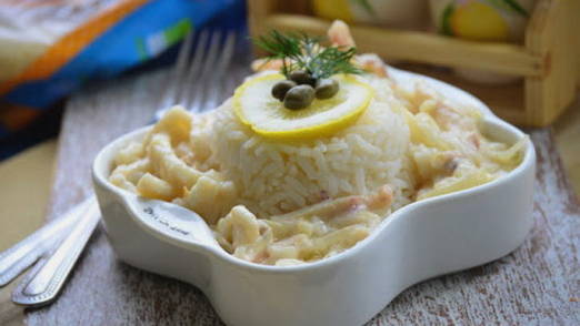 Hoe kook je rijst met inktvis in zure roomsaus?