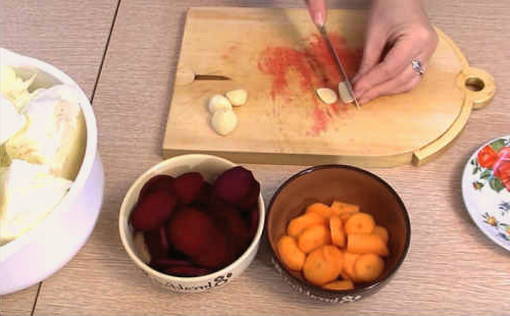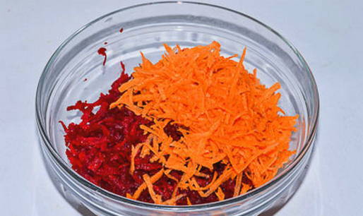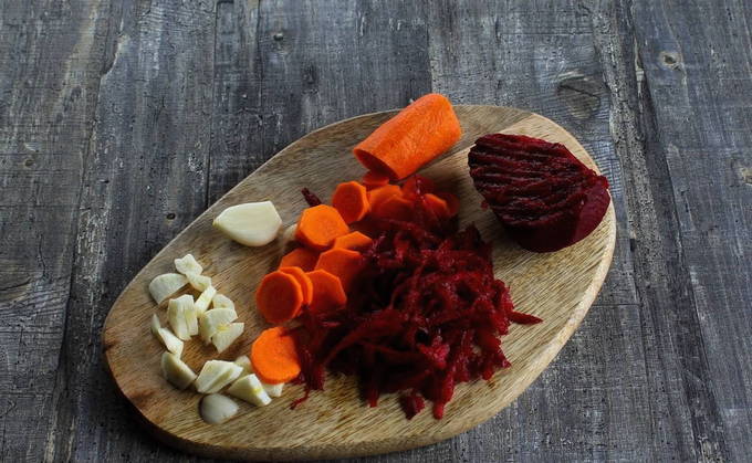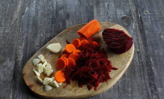 Was en schil groenten. Rasp de bieten op een grove rasp, snijd de wortel in dunne plakjes, de knoflook in plakjes.