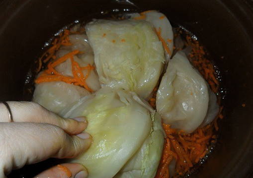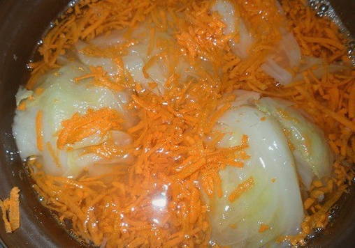 - Leg wat wortelen en knoflook op de bodem van de pan waarin de kool wordt gemarineerd.