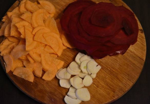 - Was wortelen en bieten, schil ze en snijd ze in plakjes. Pel de knoflook en snij in plakjes.