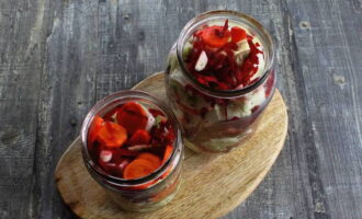 - Leg kool, wortelen, bieten en knoflook in een schone pot van 3 liter. Snijd de hete pepers in ringen en leg ze erop.