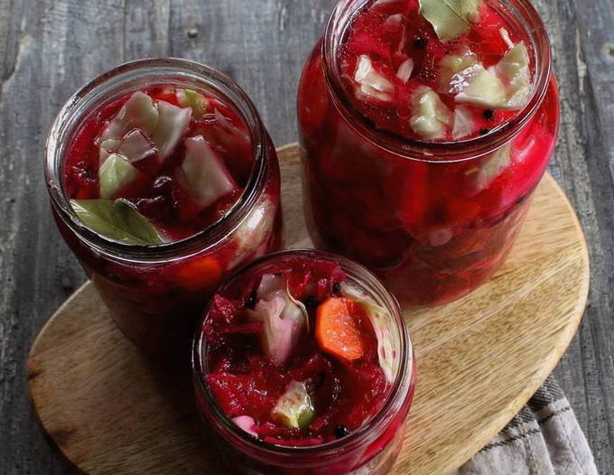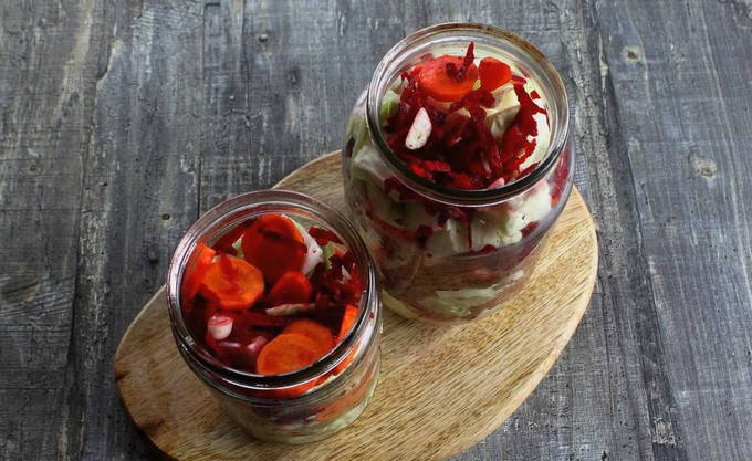 Was en steriliseer glazen potten. Leg er in lagen kool, bieten, wortelen en knoflook in, druk de groenten goed aan.