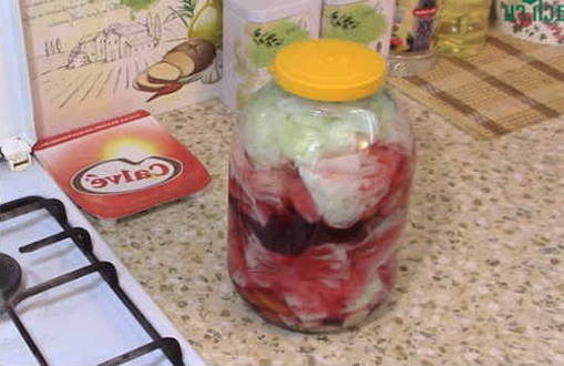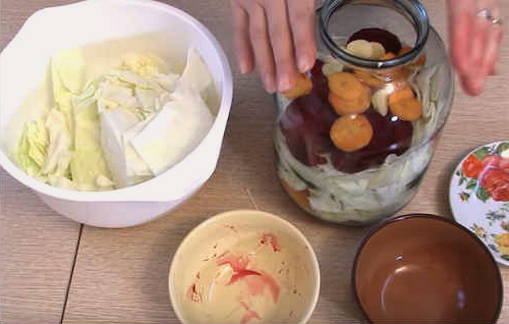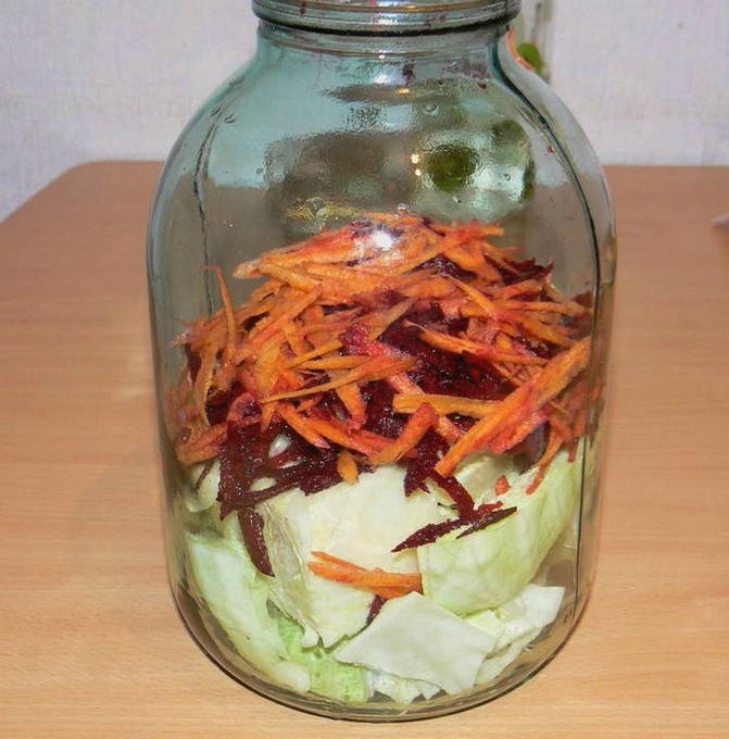 - Was de pot voor kool goed en steriliseer, kook het deksel. Laag kool, wortelen, bieten en knoflook in een pot. Stamp de groenten aan.