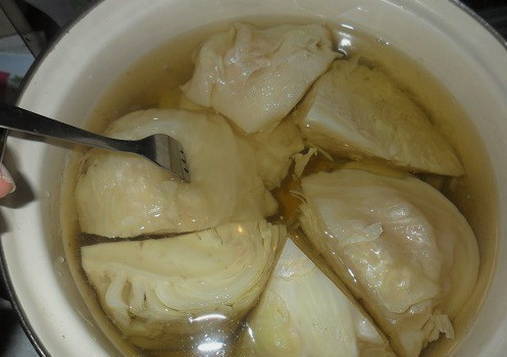 - Was de kool, verwijder de bovenste vellen, snijd de kool in 4 delen. Giet de kool met water, zout naar smaak en kook in 30 minuten gaar.