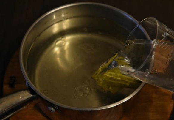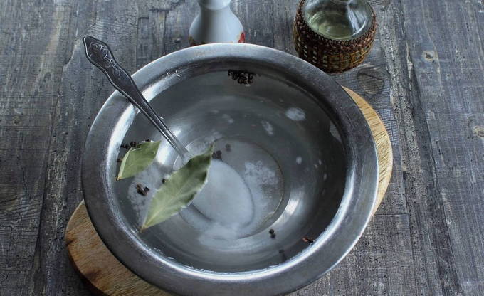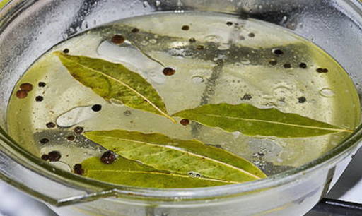 - Kook water in een pan, los hierin suiker en zout op, voeg laurierblaadjes en peperkorrels toe. Zodra de marinade kookt, haal je deze van het vuur en giet je de plantaardige olie erin.