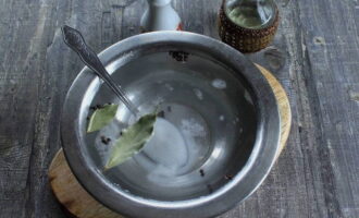 Bereid de marinade voor. Giet water in een pan, verdun zout, suiker erin, voeg laurier en peper toe, giet plantaardige olie erin. Zet de marinade in brand, breng aan de kook, voeg azijn toe en haal van het vuur.