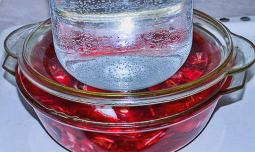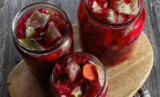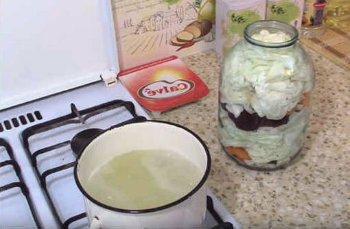 - Bereid de marinade voor. Giet zout, suiker en droge kruiden in kokend water. Als de suiker en het zout volledig zijn opgelost, giet je de plantaardige olie en azijn erbij, roer je en haal je de pan van het vuur. Giet de marinade over de groenten, sluit de pot met een deksel.