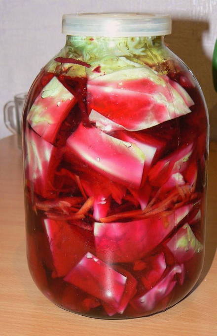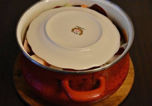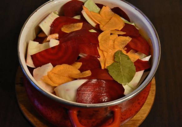- Leg kool, bieten, wortelen en knoflook in lagen in een geëmailleerde pan. Giet de hete marinade over de groenten.