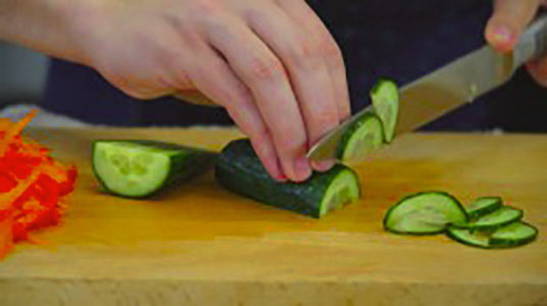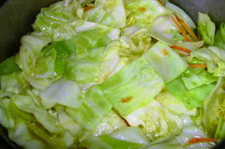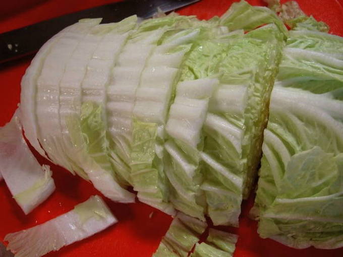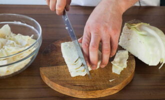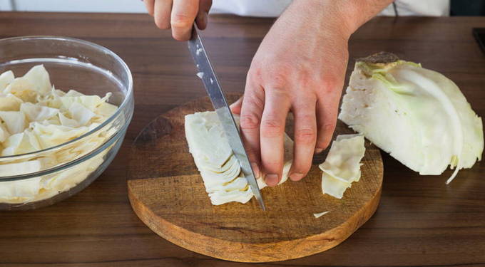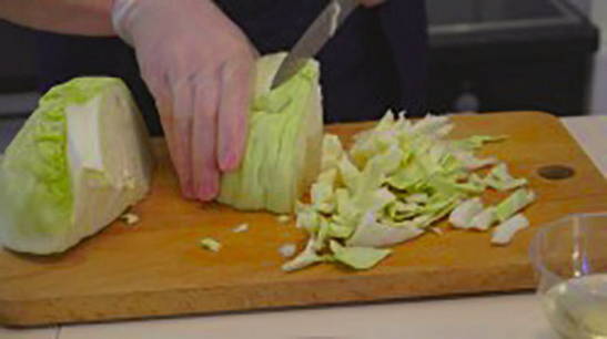 - Was de kool, verwijder de bovenste bladeren en snijd de steel af. Snijd de groente in reepjes.