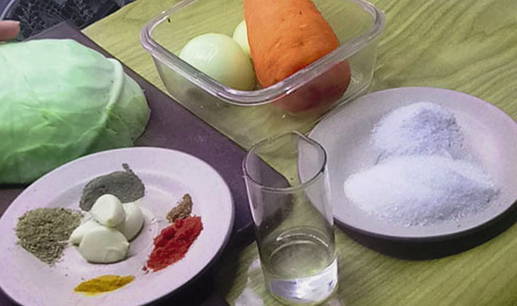 - Bereid de marinade voor. Kook water, voeg zout, suiker, azijn en plantaardige olie toe. Kook het 5 minuten. Giet de marinade over de kool. Schil en rasp de wortelen.