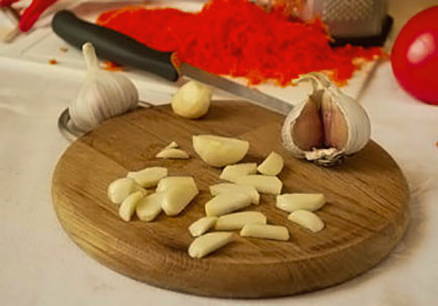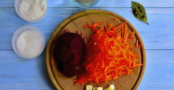 - Rasp de wortelen op een grove rasp, snijd de bieten in grote plakken, de knoflook in dunne plakjes.