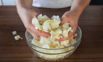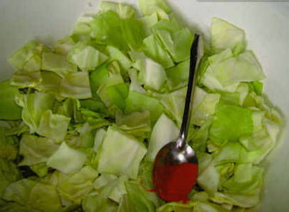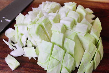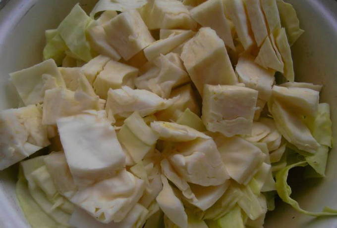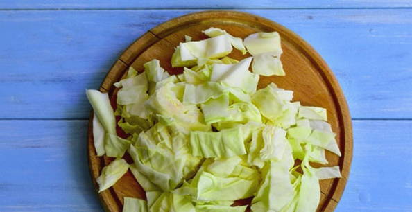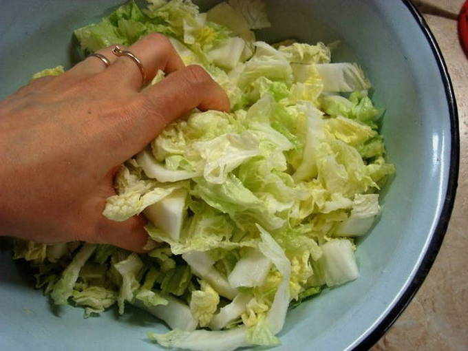 - Snijd de kool in blokjes en rimpel hem lichtjes met je handen.