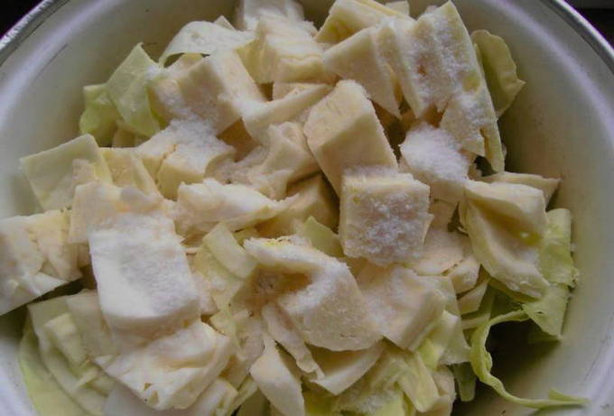 - Breng de kool over in een grote kom, voeg zout en suiker toe, roer met je handen.