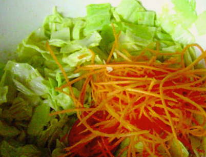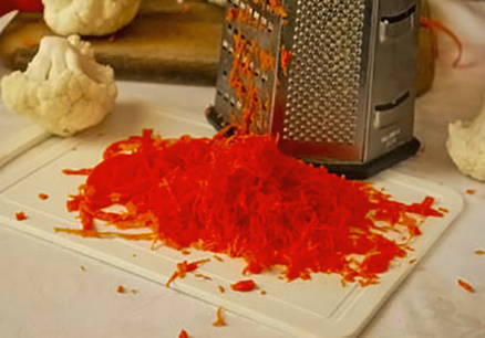 - Rasp de wortelen op een grove rasp, meng ze met kool.