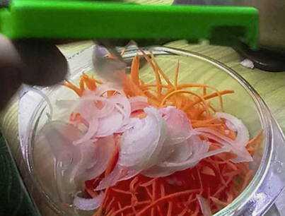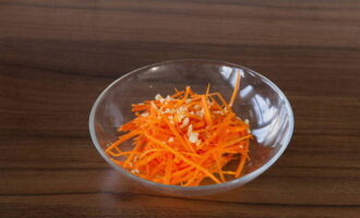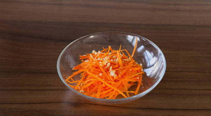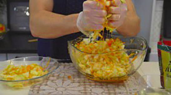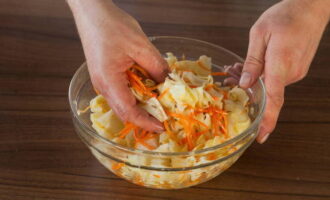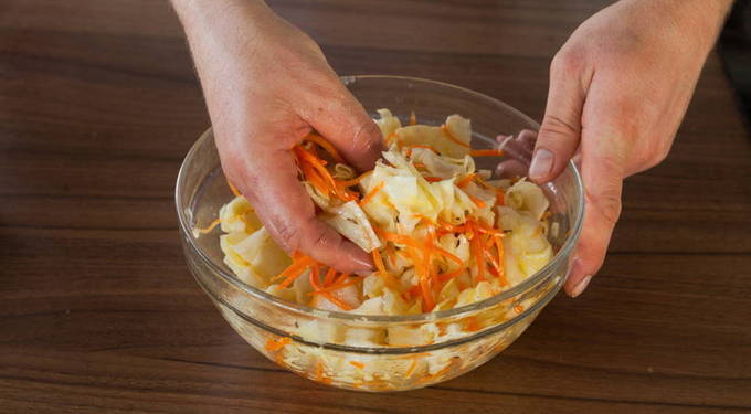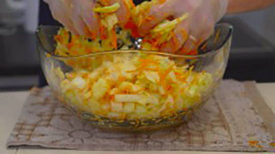 - Rasp de wortelen op een grove rasp en meng ze met kool, schud met je handen en laat een half uur staan.