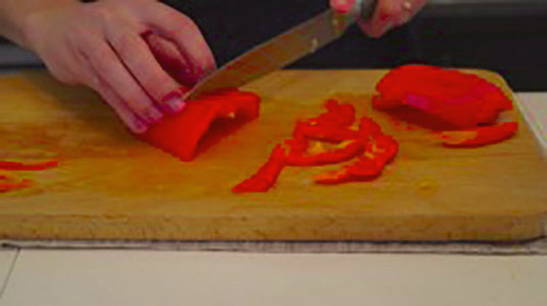- Paprika's wassen, tussenschotten en zaden verwijderen, in reepjes snijden.