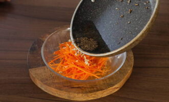 Zet een koekenpan op het vuur, giet er plantaardige olie in, steek het aan en haal het van het vuur. Voeg koriander, komijn, rode en witte pepers toe aan de hete olie, roer. Giet vervolgens de geurige oliemassa in de wortels, meng.