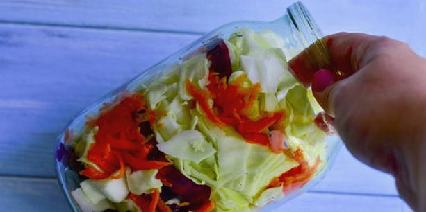 - Plaats de kool, bieten en wortelen in een gesteriliseerde pot in lagen.