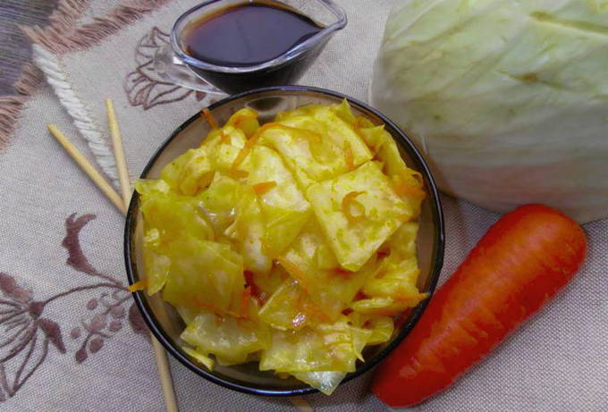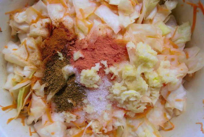 - Snijd de kool in grote vierkanten, rasp de wortelen op een grove rasp, meng de groenten met kurkuma.