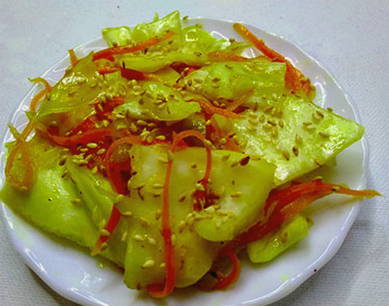 - Chinese kool in Koreaanse stijl kan worden geserveerd, bestrooid met sesamzaadjes.