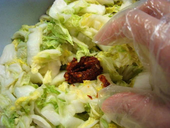 - Gebruik handschoenen om de kool met de paprikapasta te mengen. Laat de kool nog 3-4 uur staan.