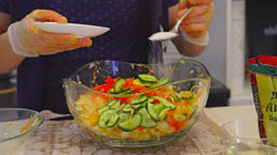 - Voeg komkommer, peper en suiker toe, meng goed.