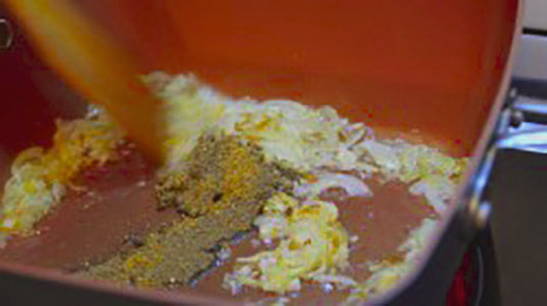 - Snijd de uien in veren, bak ze in plantaardige olie. Voeg vervolgens gehakte knoflook, gemalen peper en koriander toe aan de pan. Blijf 2-3 minuten bakken.