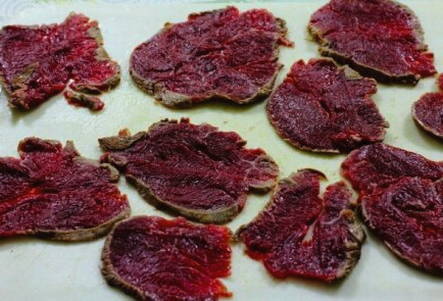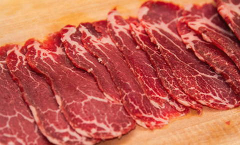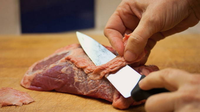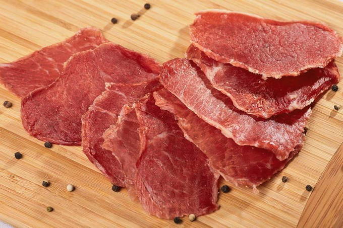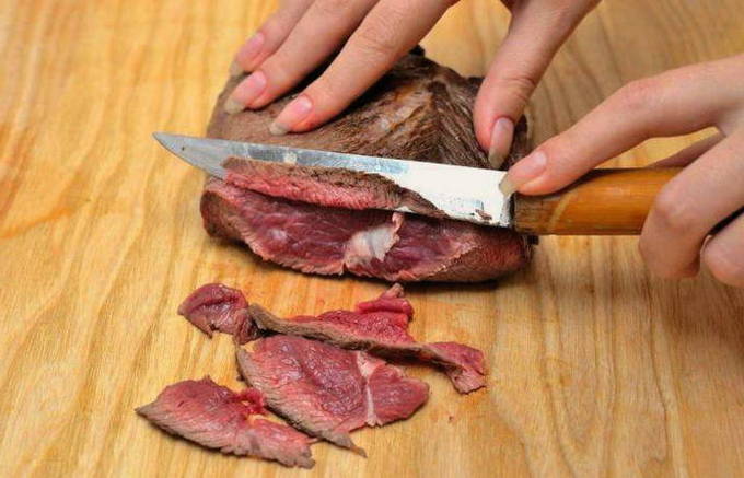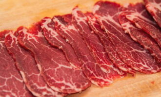 - We halen het vlees uit de vriezer. We beginnen het bevroren vlees in kleine plakjes te snijden. Hun dikte mag niet meer zijn dan 2 millimeter. U kunt een scherp keukenmes of snijmachine gebruiken. Het is de moeite waard om het vlees met handschoenen te snijden. Als gevolg hiervan moeten de plakjes dun en doorschijnend zijn. Als de dikte van het rundvlees meer dan nodig is, kun je het eraf slaan met een deegroller en het vlees tussen twee stroken huishoudfolie leggen.