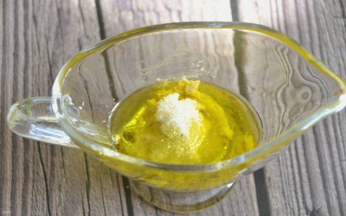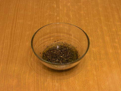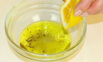 Laten we beginnen met het bereiden van de dressing en ingrediënten voor het serveren van carpaccio. Giet 2 eetlepels olijfolie in een kleine maar diepe kom. Knijp er 1 eetlepel vers citroensap bij, voeg een snufje zout toe (je kunt ook zeezout gebruiken) en een mengsel van gemalen pepers. Roer alles goed door elkaar.