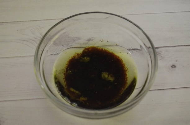 - Laten we beginnen met het bereiden van de dressing. Giet olijfolie in een diepe kom. We beginnen er citroensap, balsamicoazijn, sojasaus en zout aan toe te voegen. Meng alles goed. Voeg peper toe aan het resulterende mengsel (u kunt meer dan twee snufjes gebruiken) en roer opnieuw.